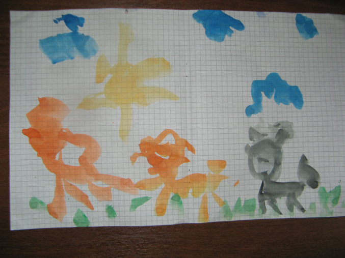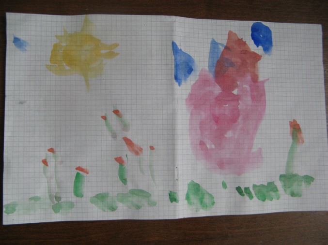 Рисовала сама,я ей только подсказывала сколько лапок рисовать и что можно нарисовать на одном листе-травку,солнышко ,тучки и т.д.