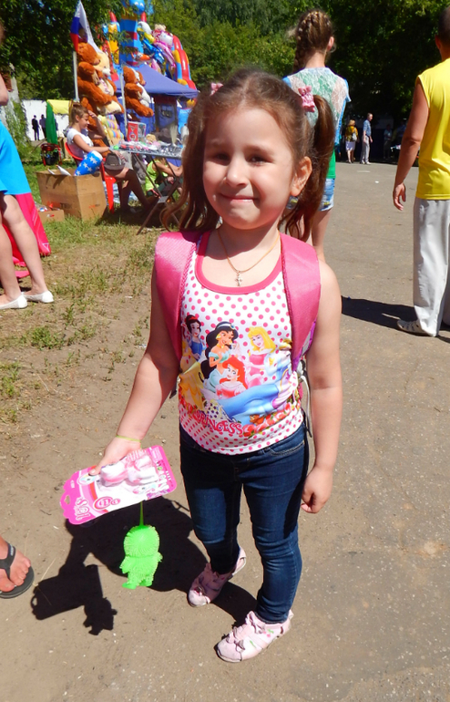 А вечером ходили на "праздник нашего двора". На футбольном поле украшают территорию флажками, ленточками, аппаратуру приносят. Устраивает этот праздник ДК Измайлово. Конкурсы, стихи, эстафеты, песни)) Хороводы, перетягивание каната. Потом чай с куличами раздавали. И маленькие сувениры. Сюзанне заколка-крабик досталась. Фотографировались, но фото с праздника позднее поставлю.