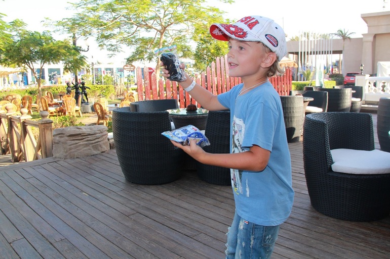 Артему перепал подарок от бармена две машинки))вообще к детям везде было очень хорошее отношение)