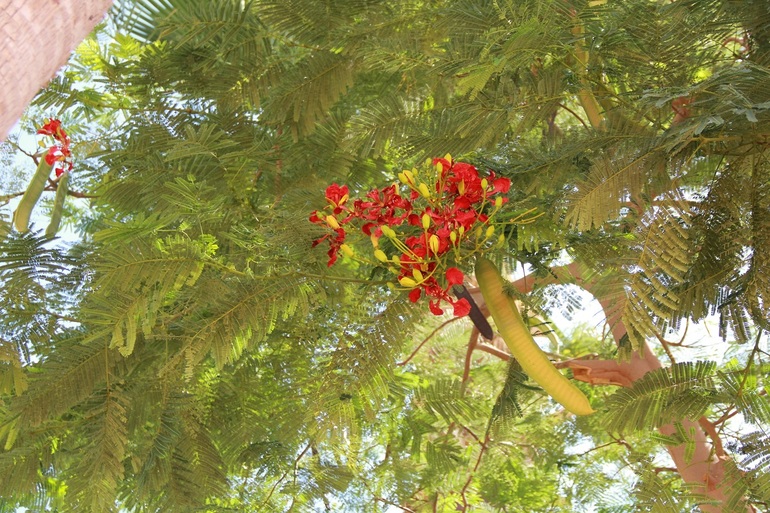еще одно красивое растение с красными цветами и длинными висящими стручками с семенами