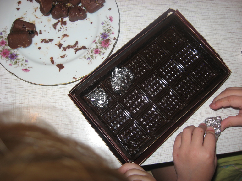 Выложила шоколадки на стол и позвала детей. Предложила сделать шоколадные конфеты. О, да они только за и руками и ногами. Наша семья- сладкоежки).