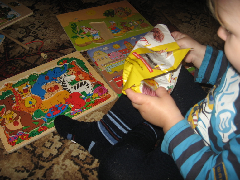 Рассказала сыну, что книги делают из бумаги, и что бумага разная бывает, та книга,которую читаем из картона. Есть еще газетная бумага и журнальная. Предложила игру "искалочка", очень ему понравилась: долго все заворачивал- разворачивал.
