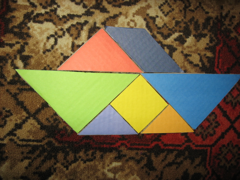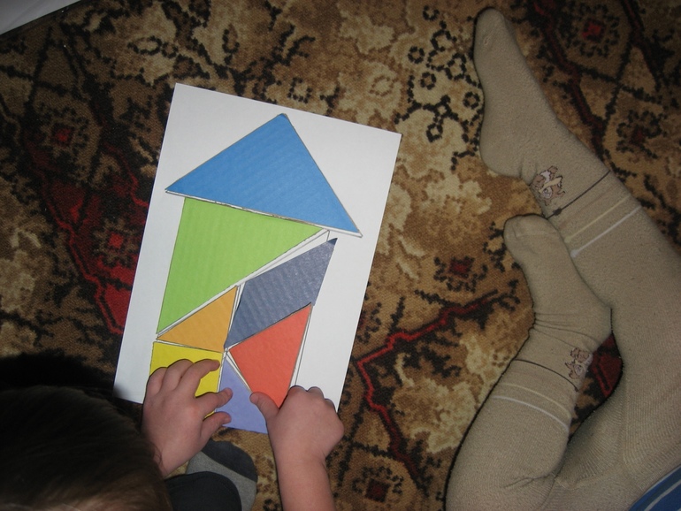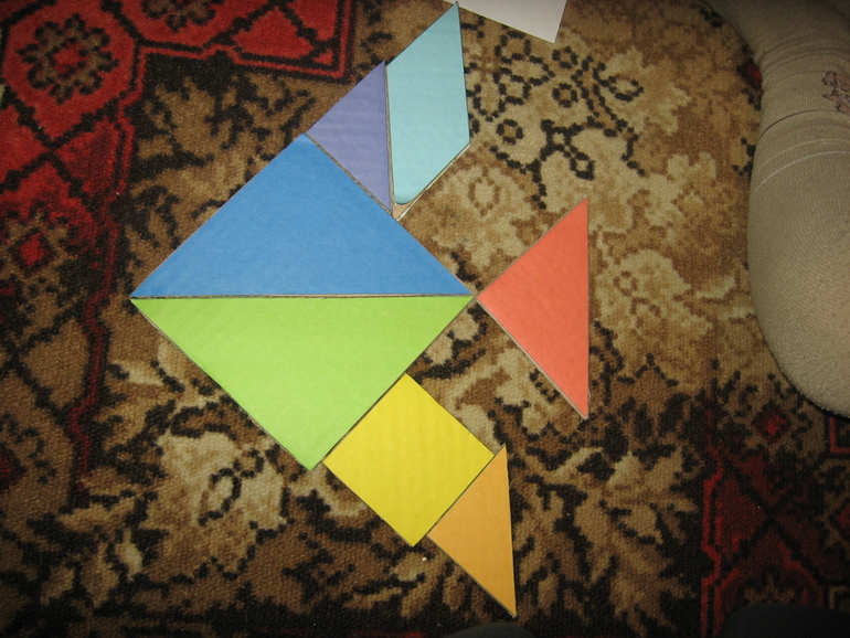 Собирали танграм ( нет у нас такой головоломки я сделала свой). Еще для меня было открытие, что муж называет это Квадратом Пифагора ( выяснилось, что у свекрови это где то запрятано и у моей мамы есть танграм- я точно знаю (не зря я еще не покупала- все есть