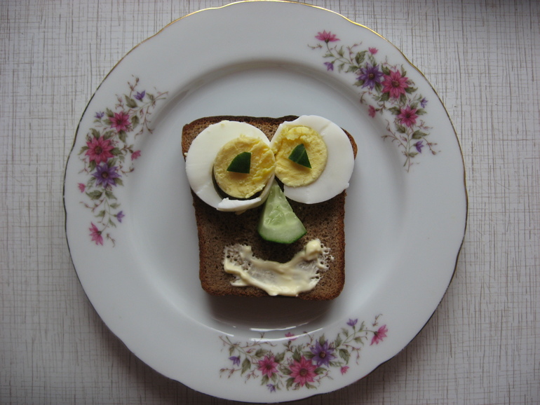 А у нас обед был. Много раз такое видела в сети, но руки почему то не доходили (кроме как кашу вареньем или ягодами украсить в виде рожицы).