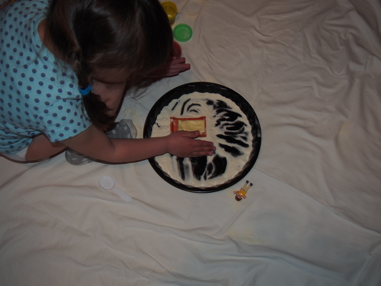 . Всю ее игру я не стала фотографировать, она и пересыпала и катала там шарики и закапывала мелкие игрушки, от истории на песке отказалась, я и не приставала, пускай играет как ей хочется.