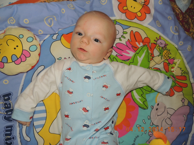 Ростик. Растет в соответствии со своим именем-не по дням, а по часам. Научился хорошо переворачиваться со спины-на бочок и на живот, но вот лежа на животике руку из под себя выдернуть не может-отсюда обида и недовольное ворчание.) По всему видно взрослеет малышок, без повода больше не плачем, в перерывах между кормлениями-готов улыбаться и гулить, только бы с ним рядом кто-нибудь находился и развлекал. Остаться в одиночестве? Эээээ нет! Не желает! Вчера купила разв.коврик в надежде, что все-таки согласится лежать и на игрухи глазеть. Ожидания оказались напрасны, лежать будет, только если мама рядом развлекает.