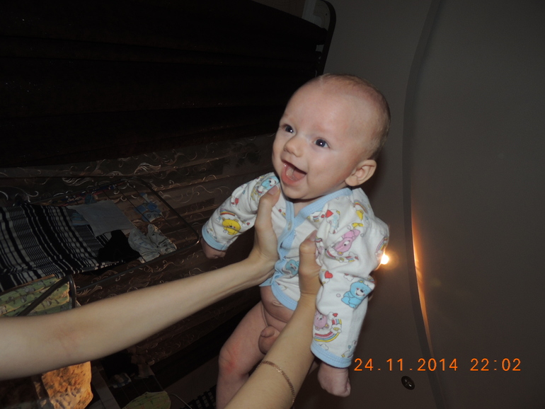 Тянется к игрушкам, хватает, но держит недолго. Гулит в основном гласными, а при плаче четко слышим МА-МА.) Улыбается много, пытается хохотать и еще часто издает такие удивленные возгласы.
