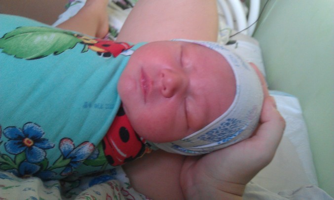Далее нужно было этот маленкий кулечек как то кормить... Естественно я никогда этого раньше не делала, и к своему стыду не удосужидась прочитать в интернете как это делается. Спасибо дежурной медсестре, которая разносила детишек, она хотя бы показала как его взять и выдавить несколько капель молока чтобы ребенок начал сосать, заманить его так сказать )) Пососал он немного, в основном спал, потом я уже поняла что это нормально, они много спят, такие крохотные )) Да и на первый раз он был сытый, а я не могла на него насомтреться, в следующий раз медсестра принести его голодным и не обманула - присосался будь здоров и не отпускал меня минут 40 ))) Потом я начала чувствовать что молоко (а может молозиво, так и не разобралась), прибывает довольно хорошо и грудь стала сильно наливаться. Как то принесли его голодным и ревущим