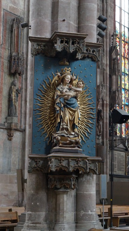 Фото ниже - это скульптура из одной из церквей Нюрнберга - церкви Св.Себальда (немного перескочила). Почему-то именно эта скульптура Божьей матери заставила меня сесть в католическом храме на скамью и замереть. Сердце пело от радости. Там были и другие статуи, изображавшие Богоматерь с младенцем, но именно эта была самой светлой и радостной для меня.