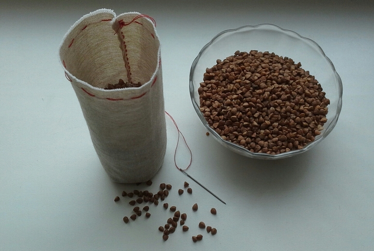 Выворачиваем мешочек на лицевую сторону и расправляем. Насыпаем в него крупу/зерно , уплотняем, постукивая мешочком о поверхность стола.