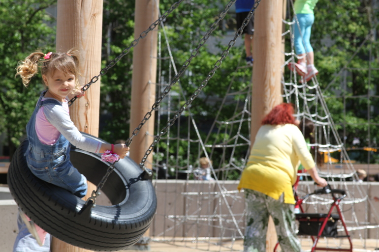 После отправились в парк, посмотрели представление морских котиков, погуляли по травке, полюбовались тюльпанами и Саша захотела на детскую площадку, там ей очень понравились качели на цепях в виде колеса и мы не могли ее снять с них минут 40 , а она требовала ее катать и заливалась от смеха так ей было радостно и нравилось: