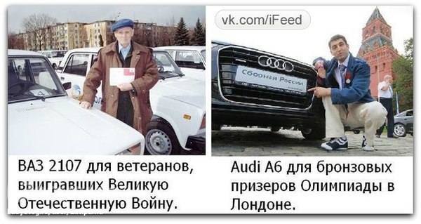 никогда не болела за россию, мне честно говоря с..ть на нее)))). как говорили в брат-2 "родина там где задница в тепле")))) просто я уверенна что у этих призеров таких ауди пруд пруди. а вот ветеранам ваз за счастье!