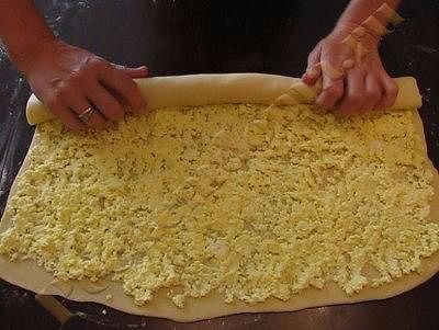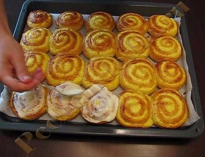 В этом рецепте творожные завитушки сразу же после выпечки заливают сметанной заливкой, плотно укупоривают и в таком виде оставляют до полного остывания. В результате завитушки получаются такими волшебно мягкими, пропитанными сметанкой (не прочтите мокрыми, вовсе нет!), а в доме стоит такой умопомрачительный АРОМАТ!!! Описывать бесполезно, это нужно пробовать! Приготовьте и все поймете сами! Для рецепта вам понадобится: Для теста: 350 г муки 3 г сухих дрожжей 100 г молока 50 г сахара 50 г качественного жирного (82%) маргарина; если совсем против маргарина, возьмите сливочное или растительное масло 70 г сметаны 3.5 г соли Для начинки: 500 г творога 1 яйцо 100 г сахара Для заливки: 200 г сметаны 1 столовая ложка сахара Из приведенного количества ингредиентов у меня получилось 20 витушек с творогом ПРИГОТОВЛЕНИЕ: В теплое молоко всыпьте сухие дрожжи, добавьте пол чайной ложки сахара, 2 - 3 чайные ложки муки (из общей нормы). Все размешайте до однородного жидкого теста и оставьте минут на 30 - 40 до появления пенной шапочки. Муку просейте. Добавьте соль, сахар и все размешайте, чтобы все сухие ингредиенты равномерно распределились по объему. Добавьте в мучную смесь размягченный маргарин, сметану и разотрите в крупную крошку. Влейте дрожжевую болтушку и замесите тесто средней консистенции - не очень тугое, но и не слишком мягкое. Поскольку мука везде разная в процессе замеса вам может понадобиться добавить немного муки (если тесто получилось жидковатым и плохо держит форму) или молока (если осталась не смоченная мука или тесто слишком тугое). Замешанное тесто накройте и оставьте в покое минут на 10 - 15. За это время мука впитает влагу, образует клейковину и тесто будет проще вымесить. Отдохнувшее тесто хорошенько вымесите до гладкого однородного состояния. Готовое тесто накройте и оставьте в тепле до удвоения в объеме. Если располагаете временем, подошедшее тесто обомните и дайте подойти во второй раз. Если времени нет, подошедшее тесто можно разделывать. Для творожной начинки творог разотрите с яйцом и сахаром в однородную массу. Если творог излишне влажный, вам может понадобиться добавить в начинку немного муки или тертых сухарей. Тесто раскатайте в прямоугольник толщиной 0.5 - 1 см. Разложите творожную начинку. Сверните тесто с начинкой в неплотный рулет. Нарежьте рулет на кусочки желаемой толщины. У меня их получилось ровно 20. Творожные завитушки свободно разложите на противень, застеленный бумагой для выпечки, накройте и оставьте минут на 40 для расстойки. В процессе расстойки завитушки должны значительно увеличиться в объеме. За 5 - 7 минут до посадки в печь смажьте завитушки разболтанным яйцом. Выпекайте при 180 - 200 С до зарумянивания. Для заливки смешайте сметану с сахаром. Сразу же после выпечки обильно смажьте завитушки сметанной заливкой, плотно накройте и оставьте до полного остывания (или хотя бы до теплого).