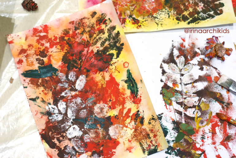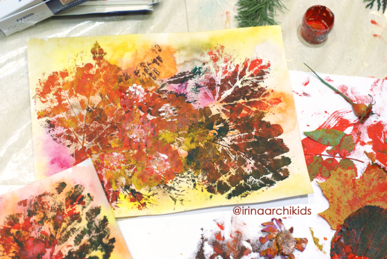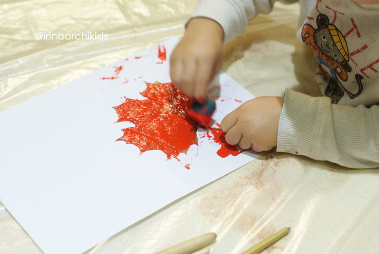 Будем красить листочки гуашью - можно это делать губкой или кистью, но старайтесь не злоупотреблять краской, так отпечатки получатся более структурными.