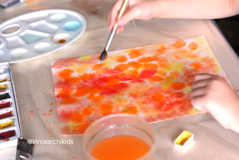 А теперь, не дожидаясь пока лист высохнет, красьте его в цвета осени используя кисти и акварель.