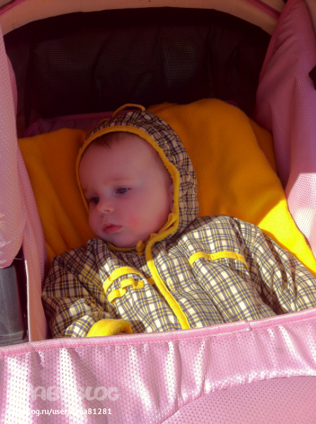 -Гуляем в прогулочном блоке, любит смотреть на себе подобных :) Приезжаем на детскую площадку и смотрим как детки на ней резвятся, потом спим.