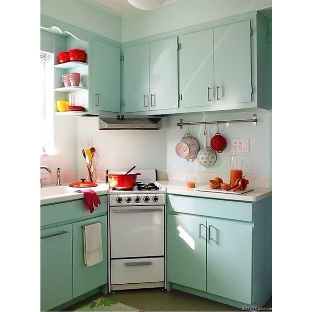 Угловая кухня. Поставить в угол плиту - хорошее дизайнерское решение. #кухня #плита #цвет #мятный #декор #дизайн #ремонт Москва #Россия