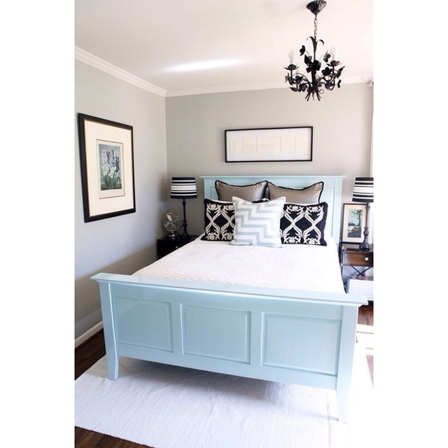 И снова идея контраста: нежно голубой и черный. #спальня #полушки #голубой #белый #черный #кровать #белье #картина #декор #дизайн #ремонт #москва #россия
