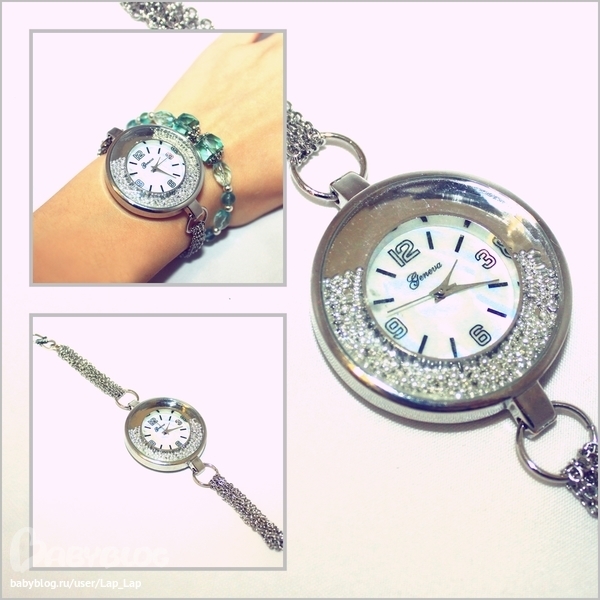 Внутри подвижный "песок" из бусин, ограненное стекло, перламутровый циферблат. Цепочка с родиевыем покрытием и серебряная застежка(чего мелочиться)