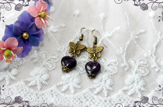 8. Серьги "Аметистовые сердечки" с бронзовой метллофурнитурой и аметистом