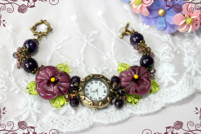 1. Часики "Анютины глазки" с аметистами, агатами, ну и конечно лэмпворком)