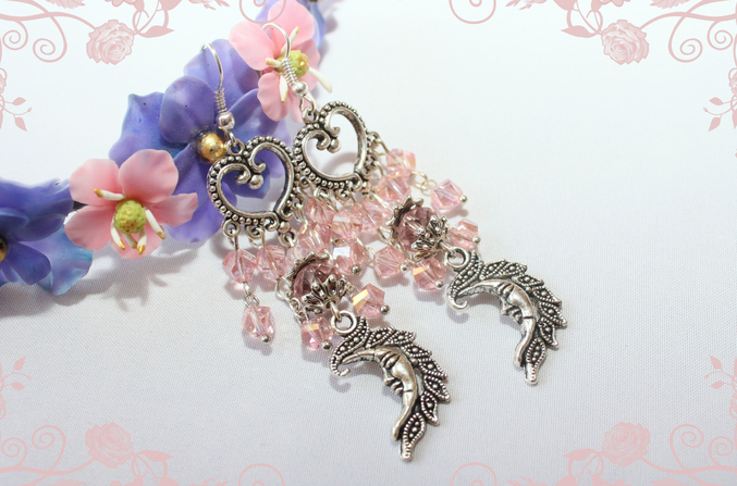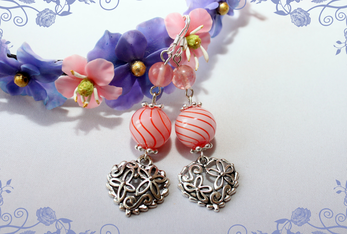 6. Серьги "Амурчики" Фурнитура под серебро, швензы-серебро, бусины лэмпворк, кварц черри