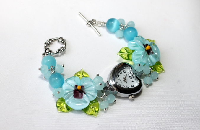 1. Часы "Анютины глазки" (голубые) Фурнитура под серебро, кошачий глаз, "цирконы", авторский лэмпворк