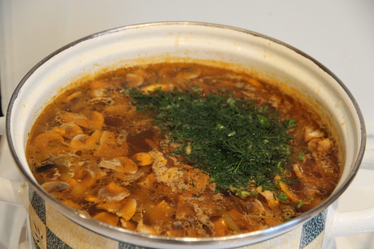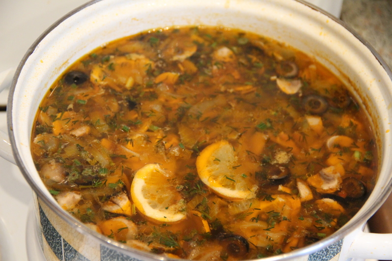 Поочередно в кастрюлю с картофелем закинуть обжарку: соленые огурцы, лук с морковкой.