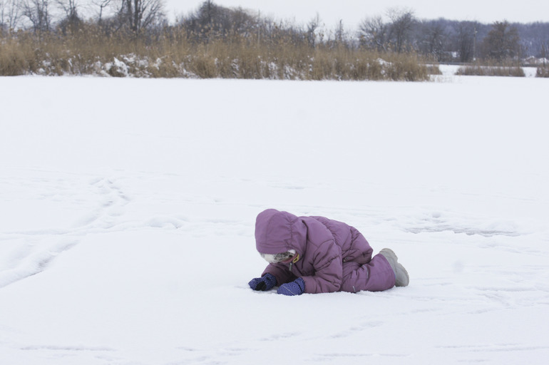 Потом детвора всё таки оживилась и выползла на лёд. Первой пошла Алиса) Долго бродила, а потом плюхнулась на пузо, расчистила снег и стала искать рыбу, которая плавает подо льдом))