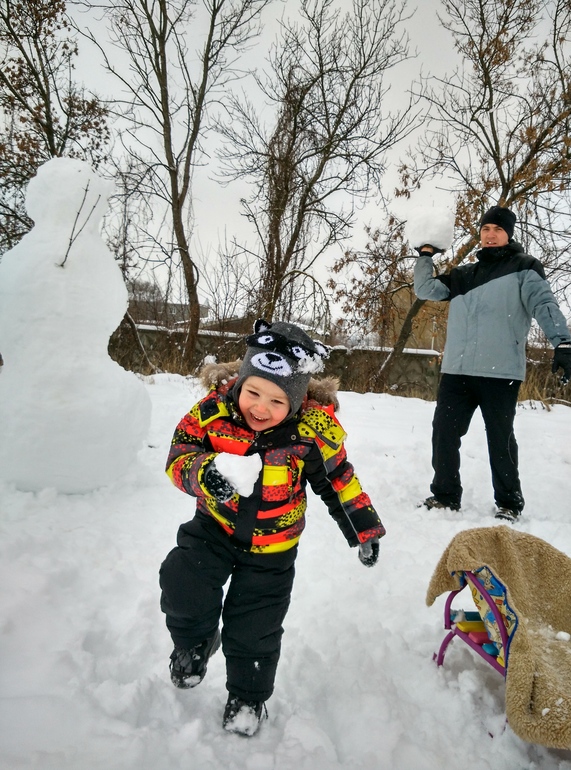 На фото - это папа не Серёжу хочет прибить таким большим снежком, это он в меня целится))) Добрейший у меня муж))) И Серёжа кстати, тоже бежит чтобы запульнуть в маму снегом)