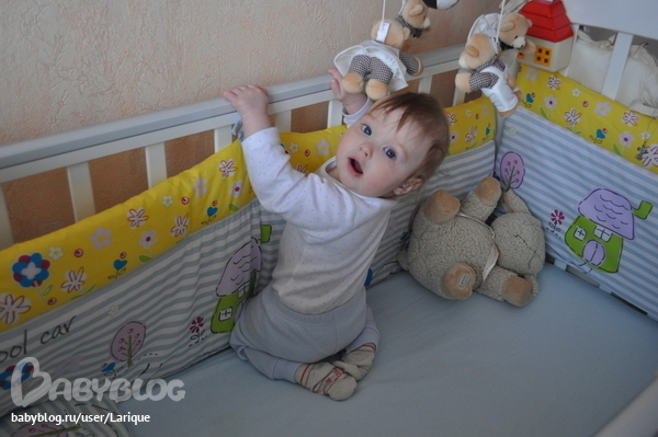 Начал-то давно уже, на диванном подлокотнике тренировался, а со вчерашнего дня поднимается за бортик в кроватке...