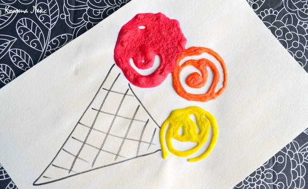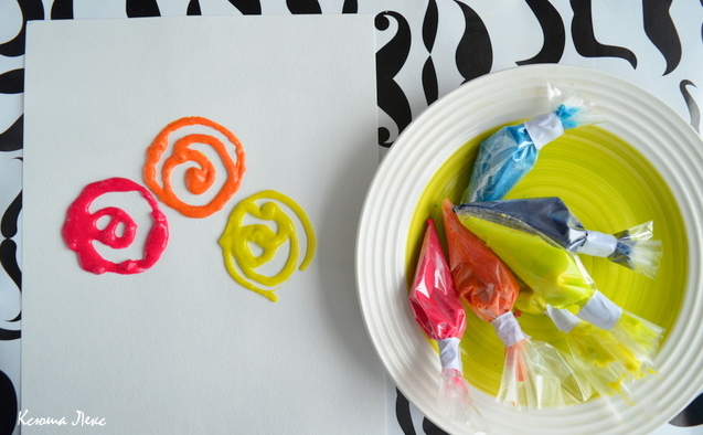 Недавно, мы попробовали новый рецепт для творчества - объемные краски!Очень легко приготовить из обычной блинной муки и пищевых красителей!