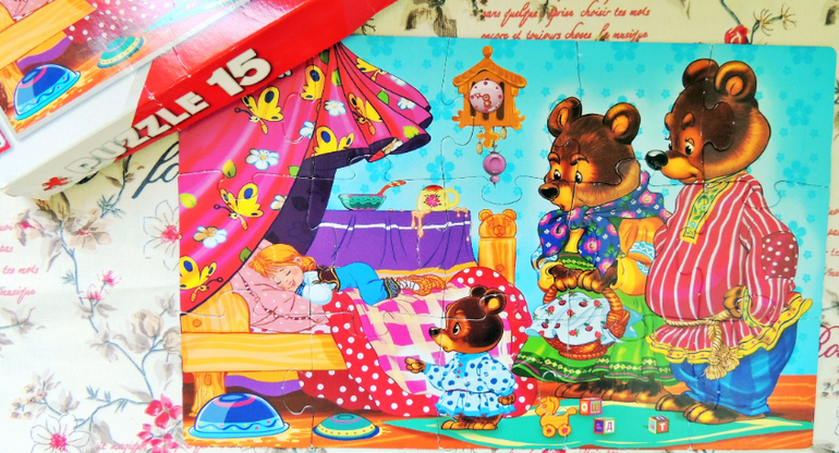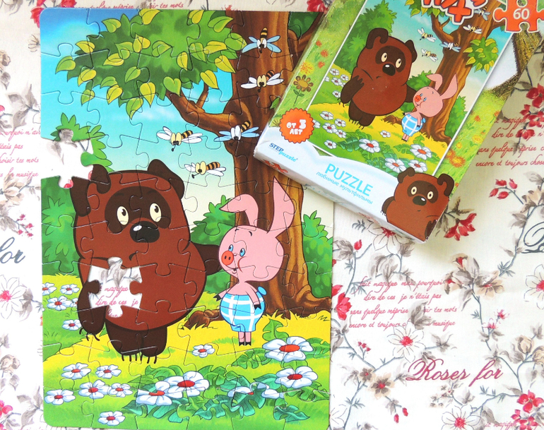 Стеша очень любила сказку про Машу и Медведя, вот и нашли максимально приемлемое на 15 деталей. Детали большие, качество неплохое, производитель "Канц-Эксмо".