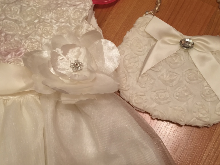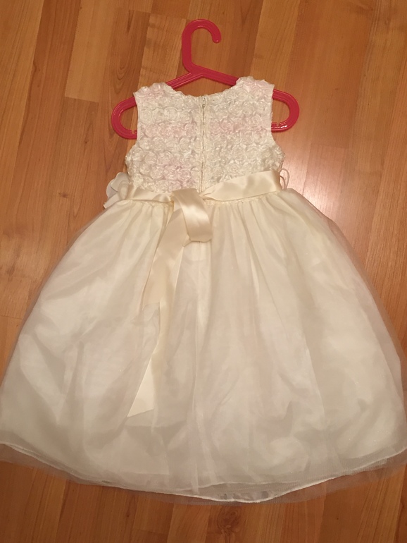 Платье с этикеткой. Цвет шампань. В комплекте милая сумочка. Пояс лента, к которой крепится брошь-цветок. Несколько слоев юбок, пышное. Размер 3-4 года. Длина 75 см.