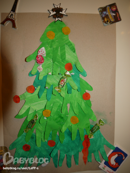 А еще можно вырезать ручки папы, мамы и ребенка-и из них склеять такую елку!