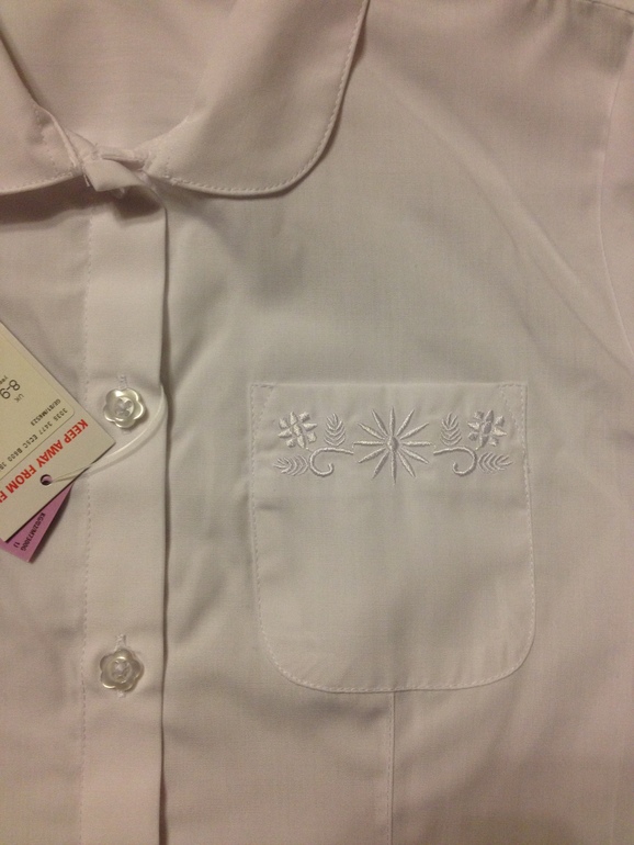 а. Рубашка с коротким рукавом-фонариком и вышивкой на кармашке.