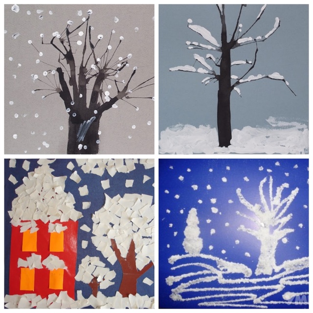 А нижнее правое заснеженное дерево-это клей пва и сверху соль. Кстати-верхнее левое дерево "выдувается" трубочкой из кляксы, а снег ватными палочками потом рисуется