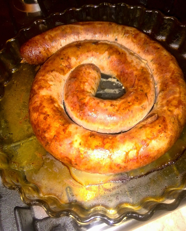 Готовую колбасу надо подержать ночь в холодильнике, затем можно жарить на сковородке, в духовке или на мангале. Приятного аппетита.