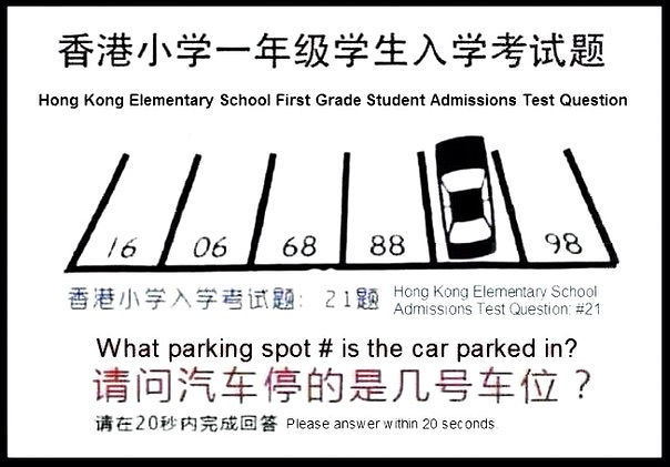 Из темы Тест на поступление в 1й класс в Китае. Ответить нужно за 20 секунд. Ваш варианты? Какое парковочное место (номер) занимает автомобиль?