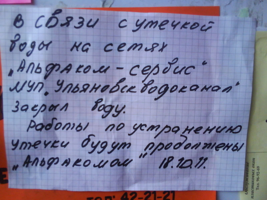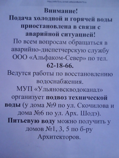 С утра воды опять не было. Хорошо, что у меня всегда 2 полные 5-тилитровые булытки с водой на всякий случай стоят. Ребенков и вчера и сегодня вытирала влажными салфетками. Выйдя в 10 утра гулять с детьми, обнаружила на подъезде 2 объявления.