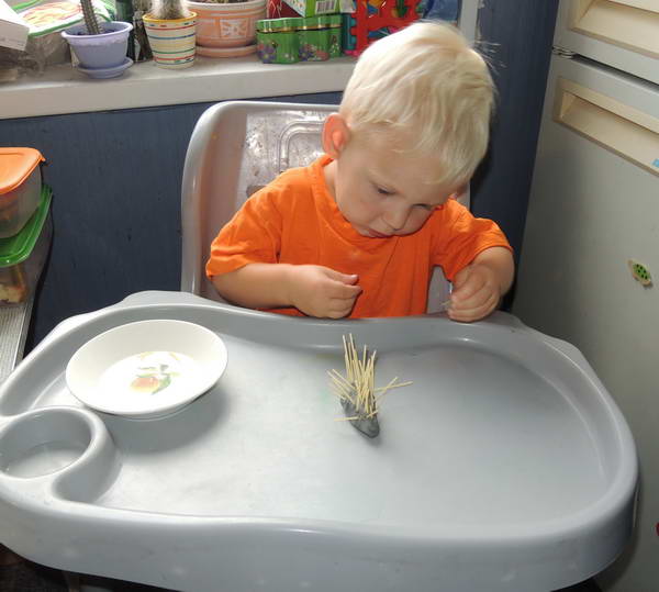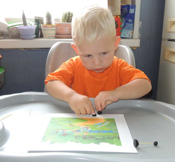 Выкладывание дороги прошло в целом ничего. Федечке нормально удалось только один рисунок, где всё надо класть горизонтально. И еще спагетти скатываются с картинки. :)