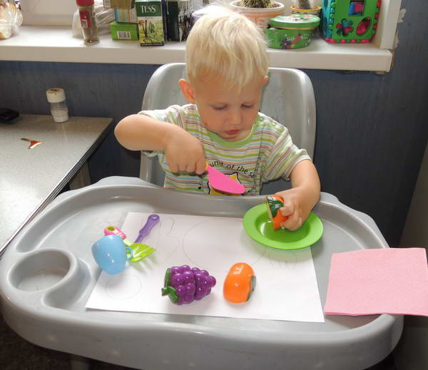 Потом порезали овощи-фрукты. Наконец-то удалось нож в правую руку всучить. У нас вообще с право-лево пока непонятки. Нет как таковой преимущественной руки.