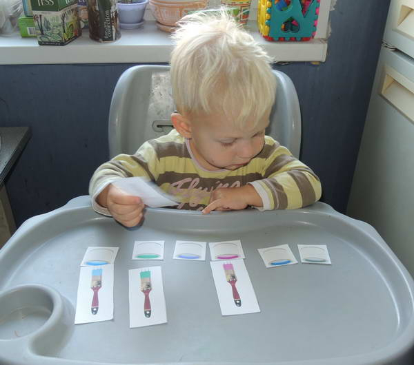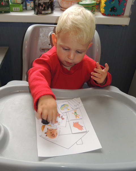 Следующее занятие - лото. Сначала Федечку смутило то, что картинки на карточках и на большой карте разные. Но в итоге сложили.