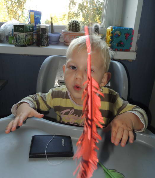 Дули на перышки. Сначала поговорили что перышки у птичек бывают. Федечка дует существенно лучше, чем раньше. Тоже прогресс.