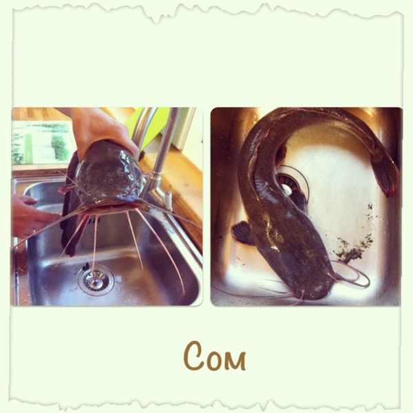 Мы даже в лес особо не ходили, потому что боимся волков и медведей. Прогулялись вдоль забора. Но грибов маленько нашли. А маслят полно набрали прямо возле дома на участке. Ужинали с друзьями вкуснючей картошкой с грибами и вот таким сомом, которого поймал притащил наш друг:
