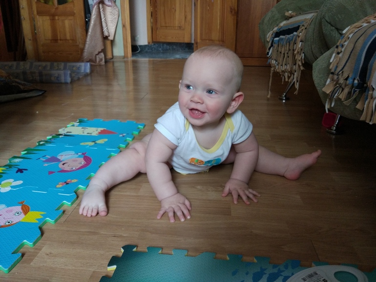 Вчера уложила днем спать, ушла в другую комнату. Через полчаса открывается дверь и вползает Игорян) То есть он проснулся, свалился с кровати, попереживал, успокоился и пошел маму искать.