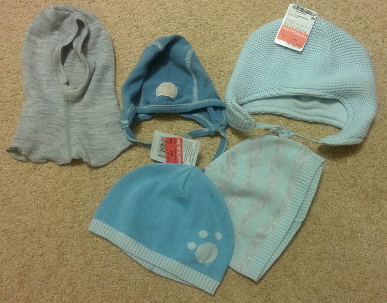 Тонкий шлем и шапочка янус из мериноса - в подарок(когда покупала подгузы), две шапочи мазекея за 300р на 3-6м, теплая шапочка на 3-6м за 400р.