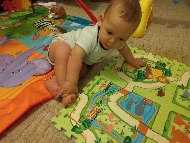 Я бы назвала этот месяц: не сидит, но присаживается; не ползет, но подползает. Весь месяц раскачивался на четвереньках и крутится вокруг своей оси на пузе. Мог пересечь комнату, но ооооочень медлено))