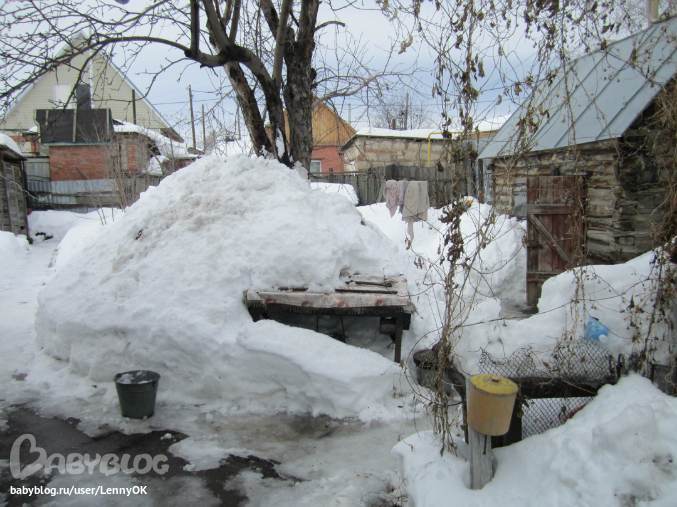 задний дворик у моей бабушки: подходы к бане завалены снегом и затоплены талой водой.