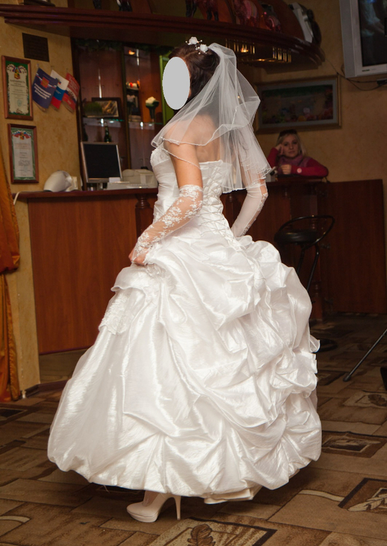 Продаю своё свадебное платье 46 размера с пышной юбкой,после химчистки,в чехле. Могу пледложить к нему подъюбник с 3 кольцами ,фату 500р, туфли 3000р. Платье из блестящего материала,расшито бисером. Подойдет на высокую девушку. Я одевала каблуки 12см, при росте 165 см,и на груди платье подняла,должно быть ниже. Всё одевалось один раз, туфли только в ресторане,от новых совсем не отличаются.